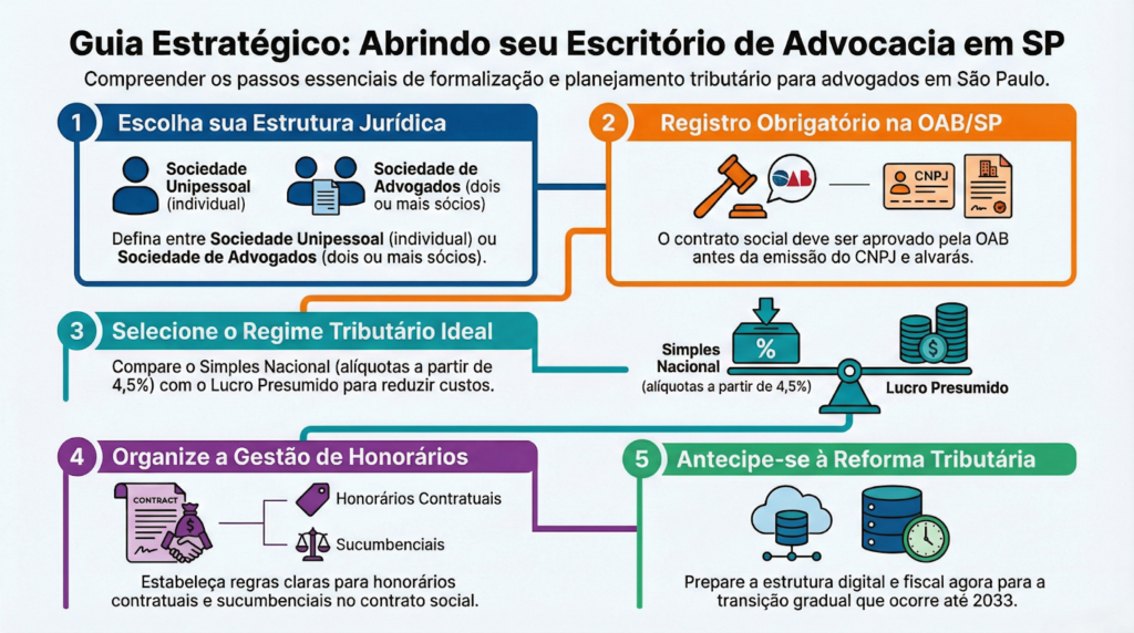 A legislação que regula sociedades de advogados é o Estatuto da Advocacia (Lei nº 8.906/1994) e as normas da OAB. Na abertura de escritório de advocacia em São Paulo, as principais opções societárias são: